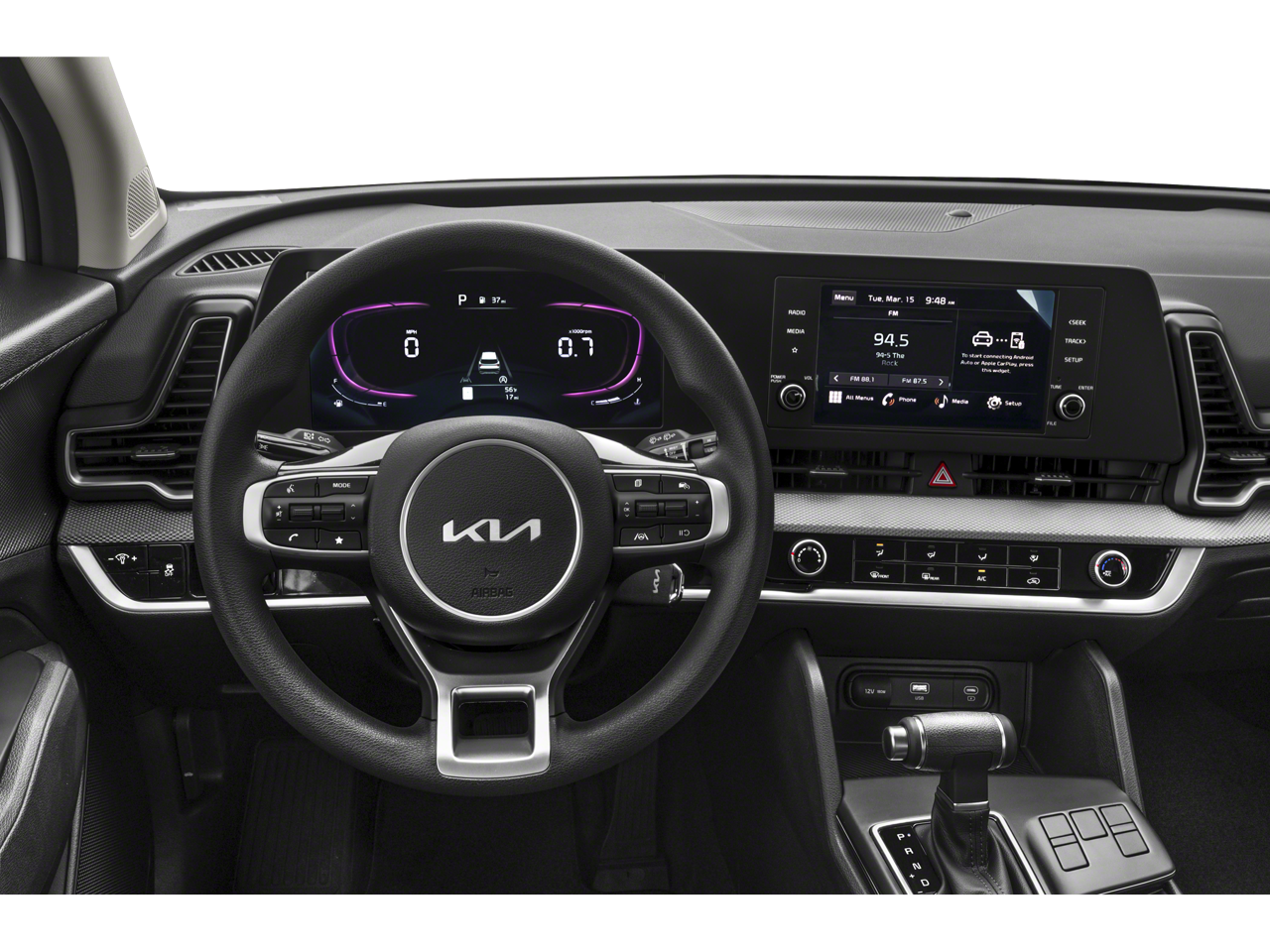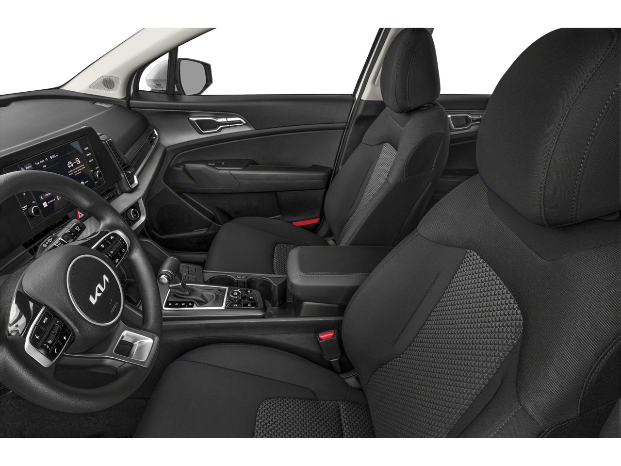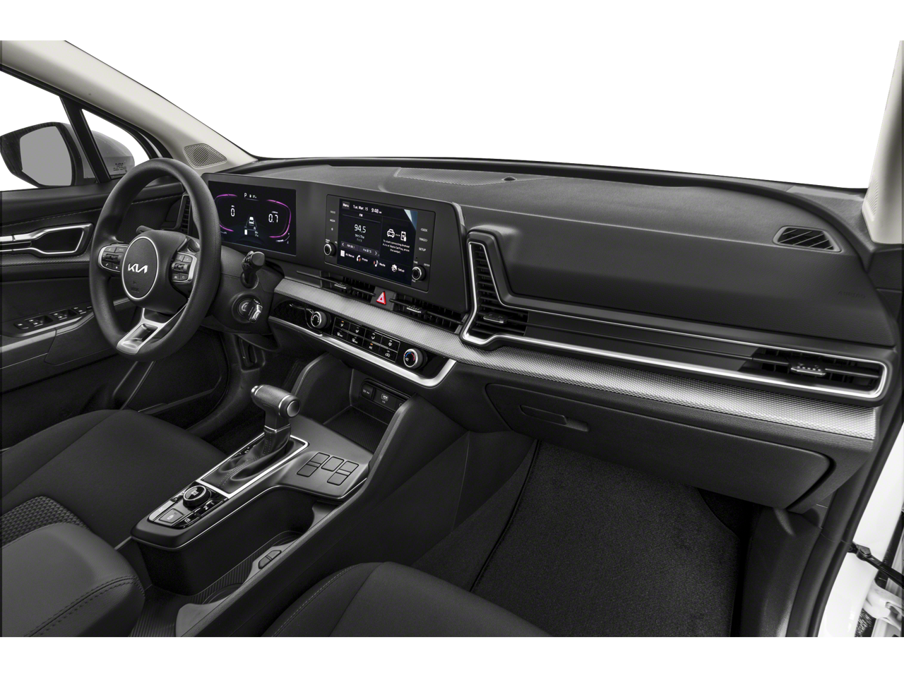 Fusion Black 2023 Kia Sportage LX FWD 8-Speed Automatic I4 17 Alloy Wheels, 4-Wheel Disc Brakes, 6 Speakers, ABS brakes, Air Conditioning, Alloy wheels, AM/FM radio, Auto High-beam Headlights, Axle Ratio: 3.648, Brake assist, Bumpers: body-color, Carpeted Floor Mats, Cloth Seat Trim, Delay-off headlights, Driver door bin, Driver vanity mirror, Dual front impact airbags, Dual front side impact airbags, Electronic Stability Control, Four wheel independent suspension, Front anti-roll bar, Front Bucket Seats, Front Center Armrest, Fully automatic headlights, Illuminated entry, Low tire pressure warning, Occupant sensing airbag, Outside temperature display, Overhead airbag, Overhead console, Panic alarm, Passenger door bin, Passenger vanity mirror, Power door mirrors, Power steering, Power windows, Radio: AM/FM/HD Audio System, Rear anti-roll bar, Rear seat center armrest, Rear window defroster, Rear window wiper, Remote keyless entry, Security system, Speed control, Speed-sensing steering, Split folding rear seat, Spoiler, Steering wheel mounted audio controls, Tachometer, Telescoping steering wheel, Tilt steering wheel, Traction control, Trip computer, Variably intermittent wipers.
